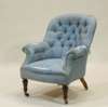 the arched back with out-stretched scrolled arms, the cushioned seat raised on fluted tapering legs with brass caps and castors
