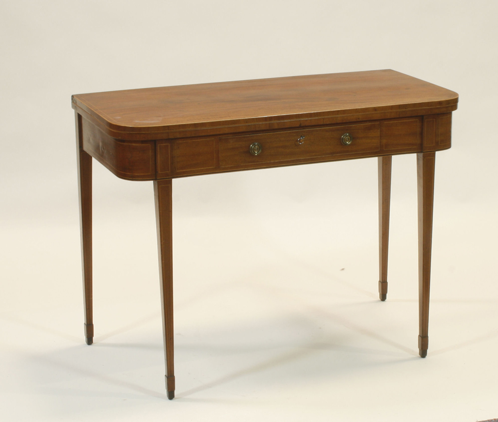 the boxwood and ebony strung rounded rectangular top over a single frieze drawer, raised on tapering square legs with spade feet