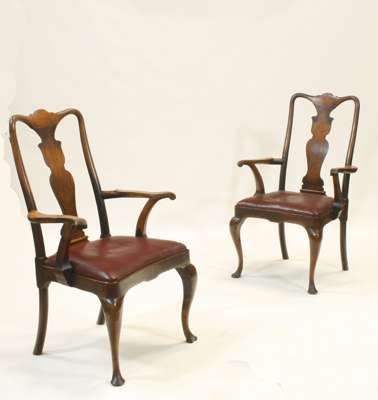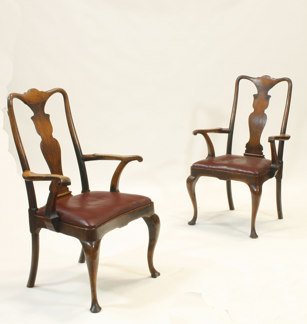 each with serpentine top-rail over a fiddle back splat, open arms with burgundy drop-in serpentine seat, raised on cabriole legs with pad feet; (similar to the proceeding lot) (4)