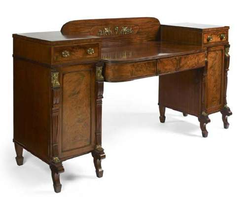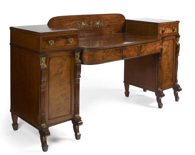 of break bow front form, the ledge back with gilt brass female mask flanked by scrolling arabesques and winged chimera holding quiver trophies above a pair of beaded frieze drawers flanked by pedestals with frieze drawers above panelled doors each divided by a pair of reeded uprights headed by stiff leaf decoration and pharoah mask capitals, on hipped sabre legs ending in spade feet