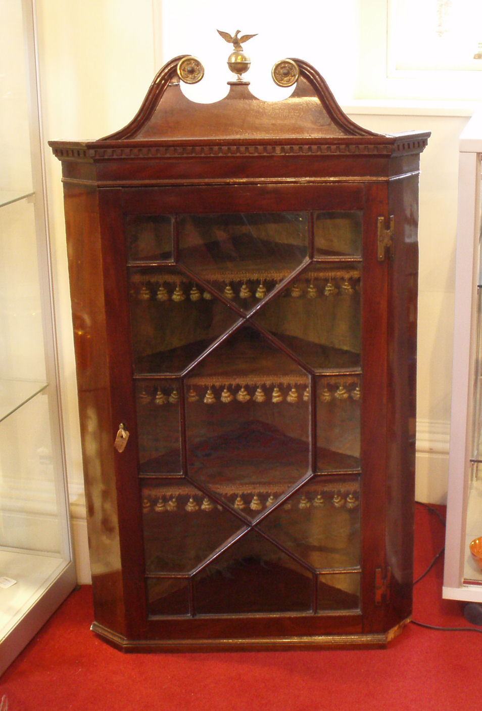the swan neck pediment with brass hoho bird finial above a dentil frieze, the astragal glazed doors enclosing shelves, flanked by canted corners