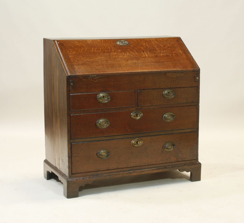 the moulded fall flap enclosing a fitted interior, over two short drawers and two graduated long drawers, raised on bracket feet