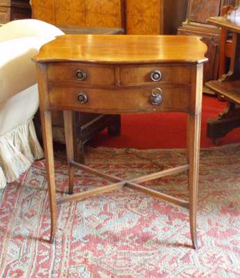 with two short drawers over a single boxwood strung drawer, raised on square tapering legs, with slayed feet united by stretchers