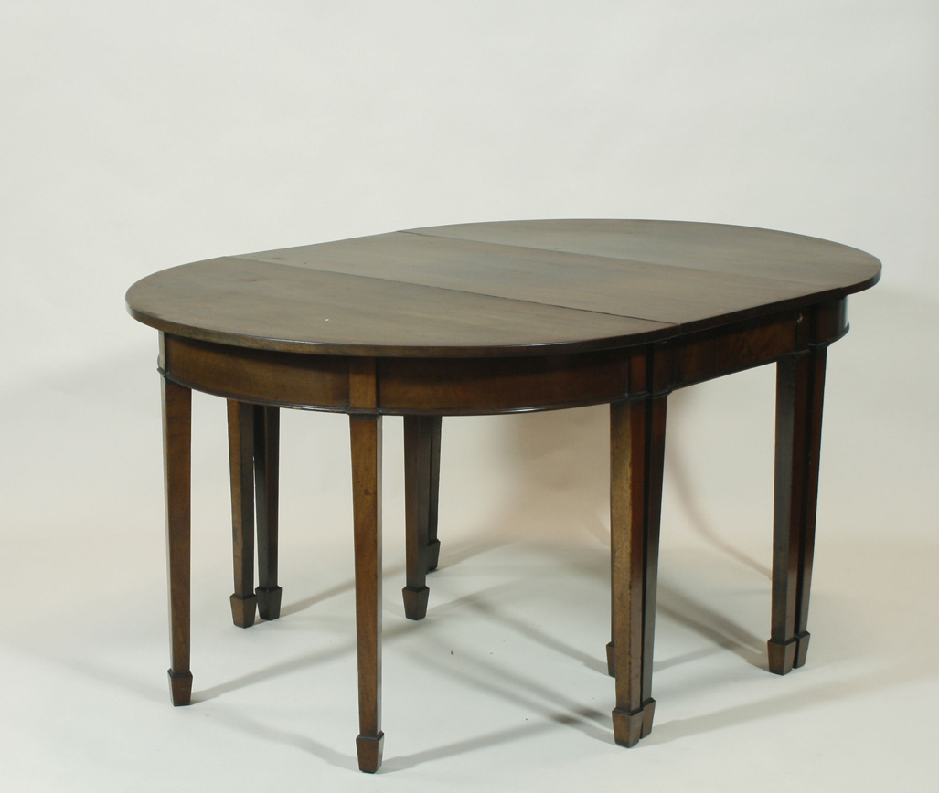 with two leaf insertions and central six leg section, the top above a plain frieze and raised on square tapering legs with spade feet (alterations)