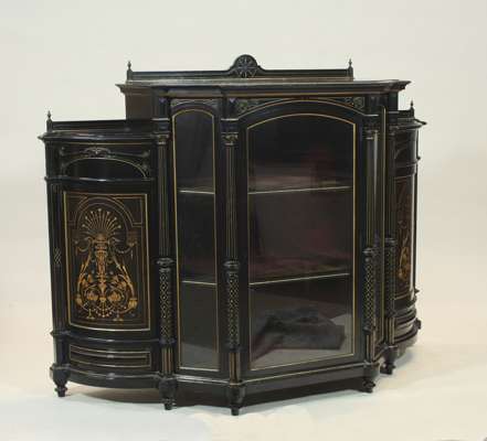 the shaped pediment over moulded top, the glazed doors divided by corinthian columns and canted panels, enclosing two fixed shelves, flanked by convex box wood inlayed doors, raised on turned feet