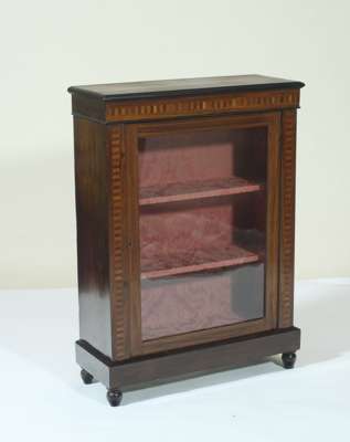 the moulded rectangular top over cross banded frieze boxwood strung glazed door enclosing two shelves, the plinth base raised on bun feet