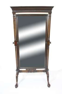the projected dentil cornice over a fluted frieze panel, the rectangular mirror plate with similar frieze border, flanked by grouped turned column supports, united by matching stretcher, on acanthus carved cabriole legs with claw and ball feet