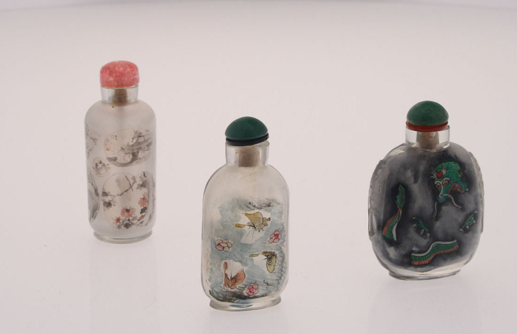 of cylindrical form, decorated with shaped panels, 7.5cm; another of flattened rectangular form, decorated with dragon, 6.5cm high; and another small flattened rectangular bottle, with butterflies, landscape and character marks, 6.5cm high (3)