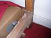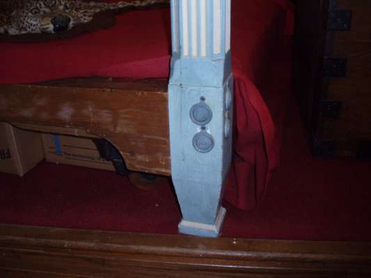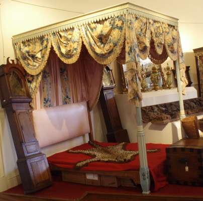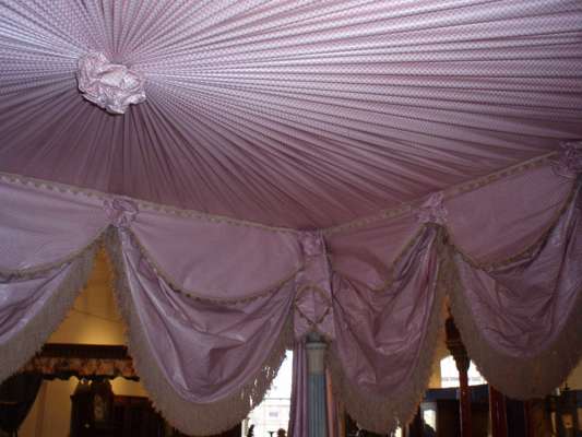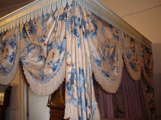 with foliate carved pediment over tapering reeded columns, covered with drapes etc.
