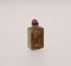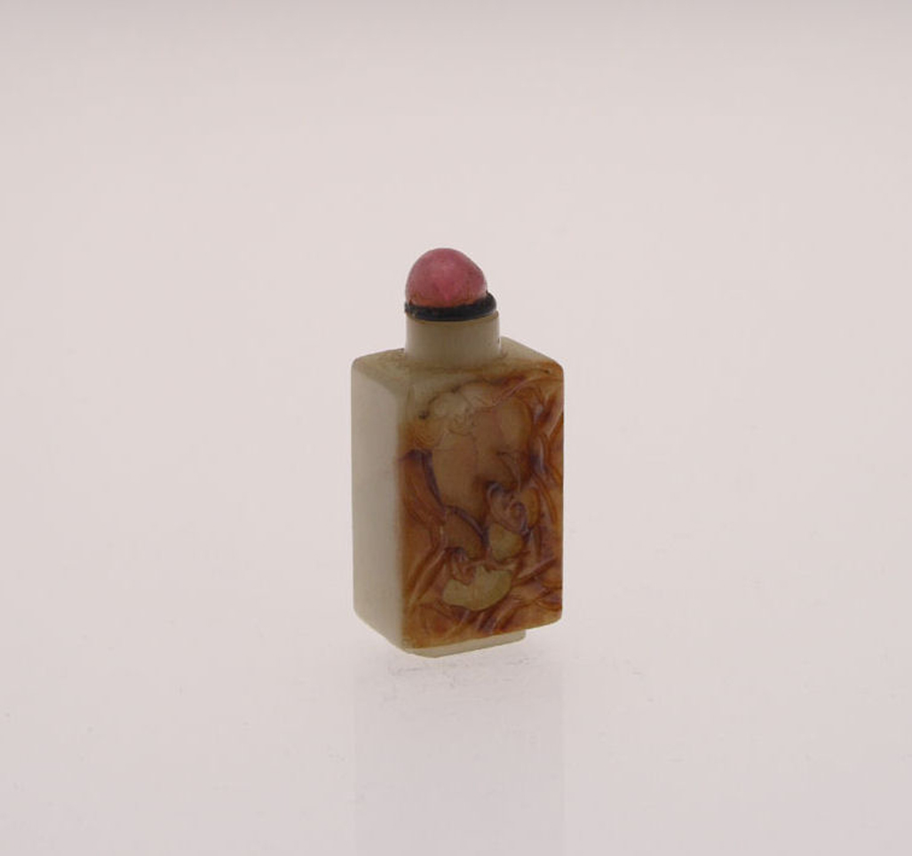 of rectangular form, decorated with leaves to one side and characters to the other, with amethyst stopper