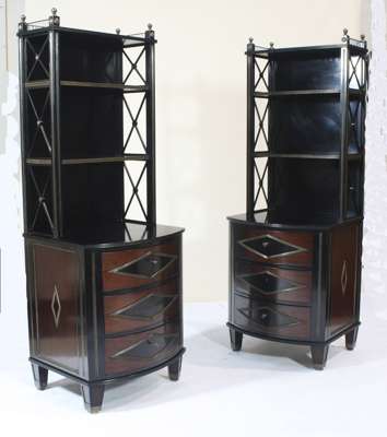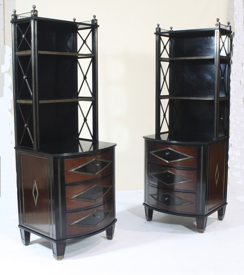 each with brass three quarter gallery with ball finials, the reeded bow fronted top over three open shelves flanked by lattice work above three mahogany drawers with brass and ebony inlay, with matching side panels, raised on tapering block feet (2)
