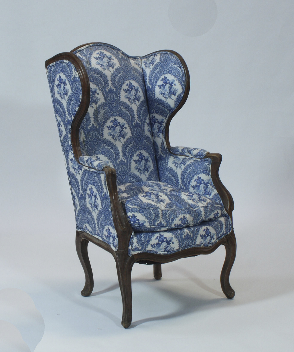 the moulded frame and arched back flanked by deep wings over pad arms, the loose cushioned seat with serpentine apron, raised on cabriole legs