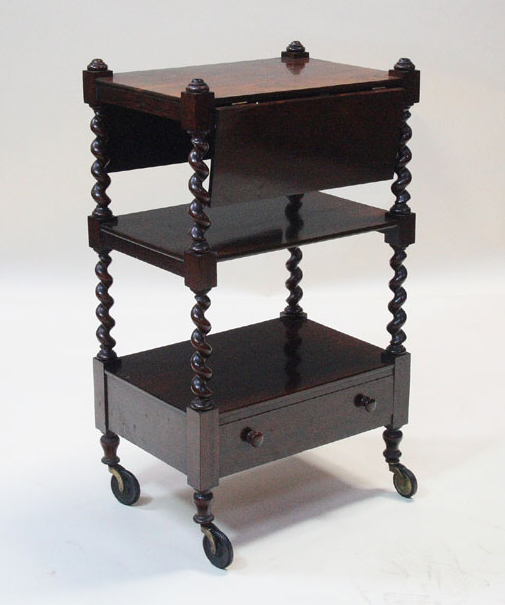 the rectangular top on block and spiraly turned supports with fall flaps over two open shelves a single drawer, raised on squat baluster feet, with later castors