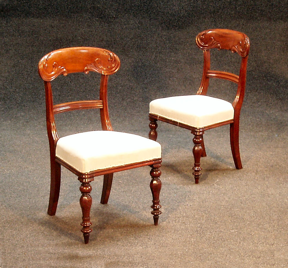 the foliate carved bar backs above overstuffed seats, on faceted baluster turned legs (6)