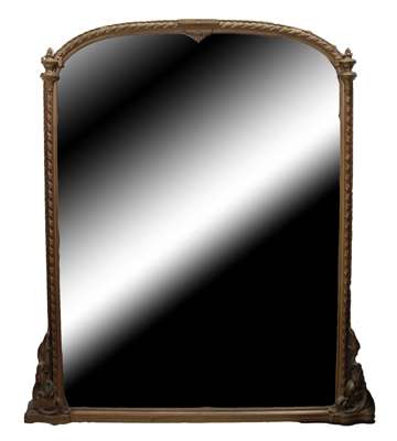 the arched top with ribbon twist frame topped by finials, plinth base with large foliate supports