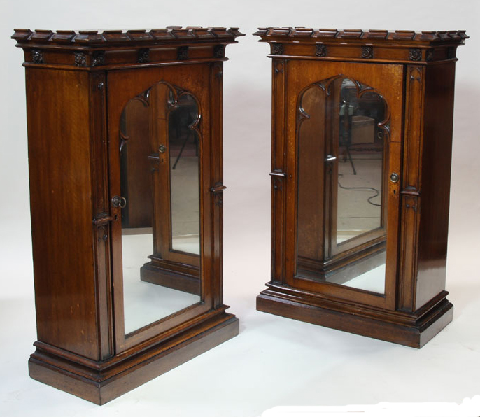 A pair of Edwardian pine Gothic style mirror door cabinets