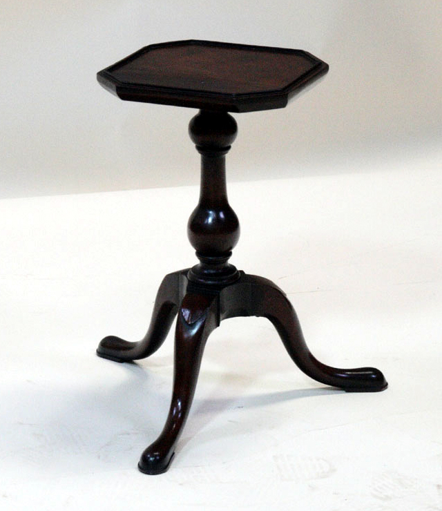 the octagonal low galleried top on a baluster turned stem and triple cabriole leg base