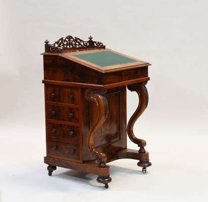 the pierced fretwork gallery over a rise compartment fitted with drawers and pigeon holes, the moulded writing slope with green skiver over plain panel with four end drawers and opposing dummy drawers, carved cabriole supports terminating in C-scrolls, turned caps and brass castors
