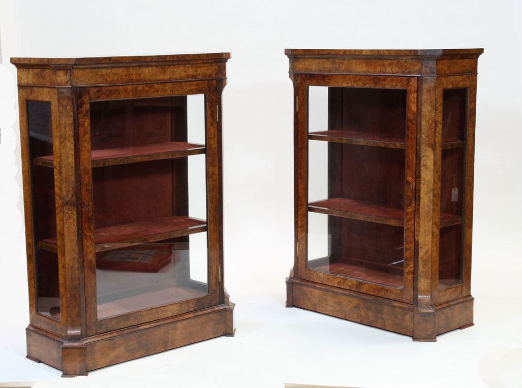 each with projected rectangular top with canted corners, with plain frieze panel over glass door and with similar side panels, enclosing shelves, raised on plinth base (2)