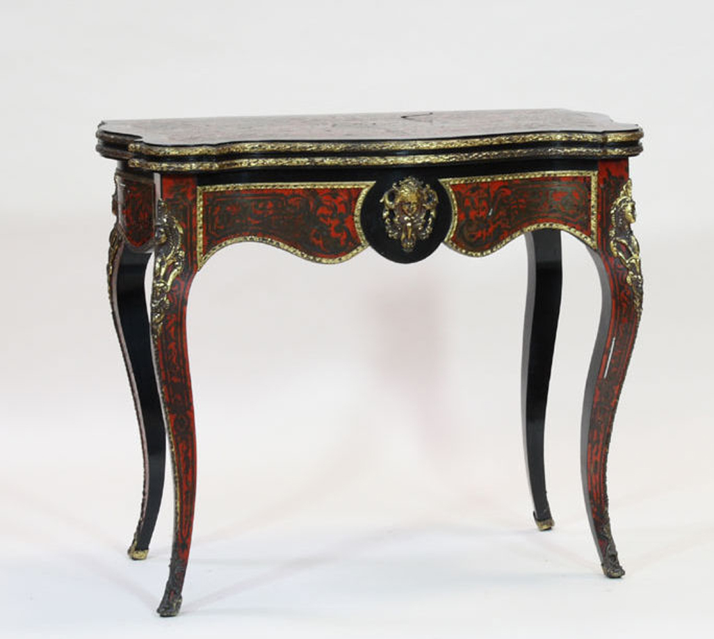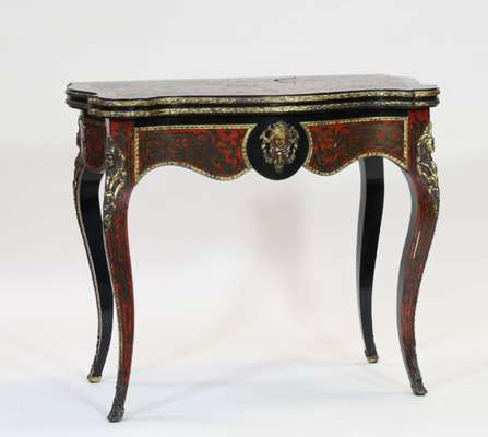 the serpentine top and apron with brass inlay decorated with masks and foliate design, cabriole legs terminating in sabots