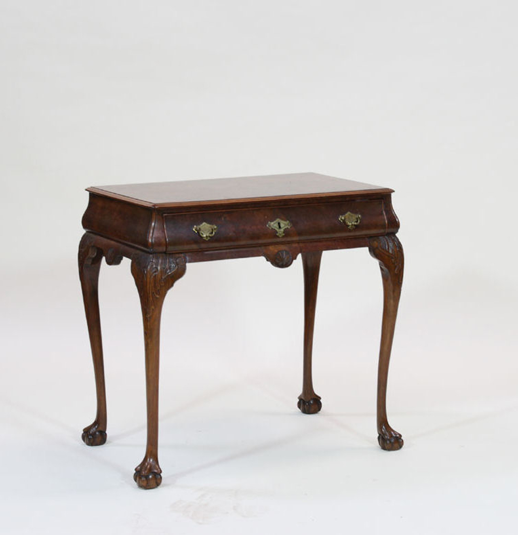 the quarter veneered burr walnut top above a bombe drawer and sides, on leaf carved cabriole legs terminating in claw and ball feet