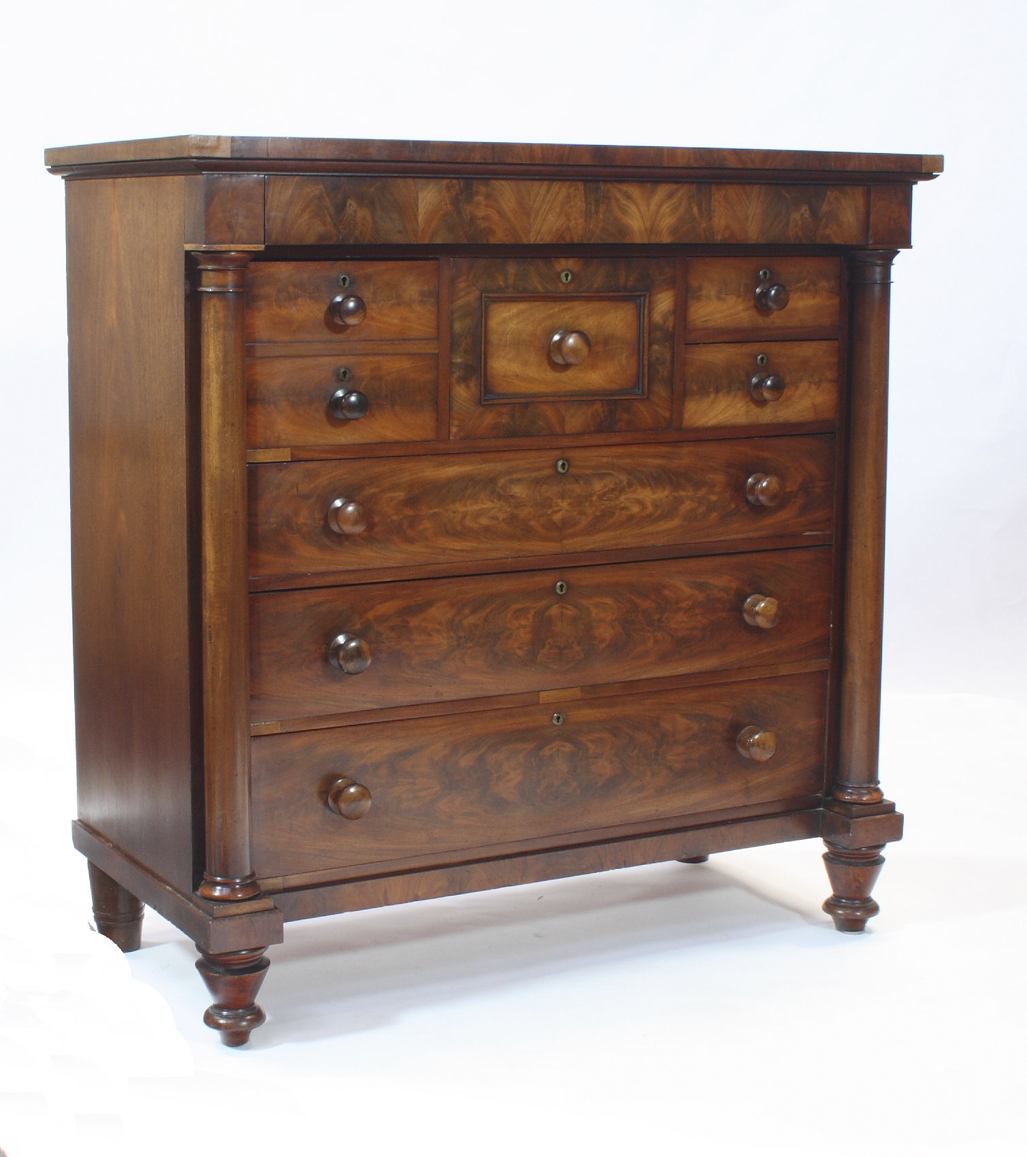 the moulded top over plain frieze drawer with three short and three graduated long drawers flanked by pilasters, raised on turned feet