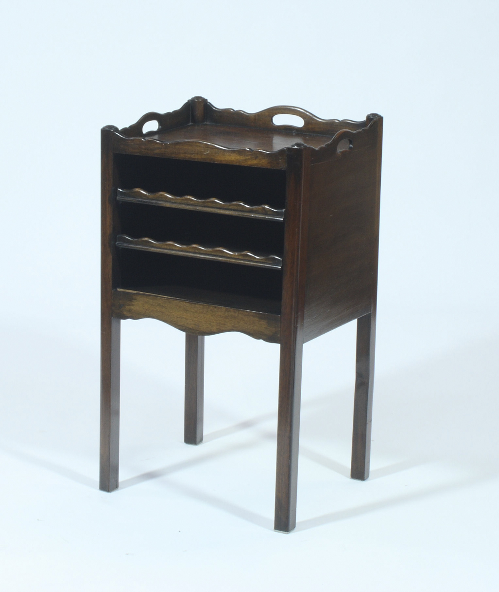 the moulded shaped gallery with pierced handles over three open shelves, serpentine apron, raised on square legs