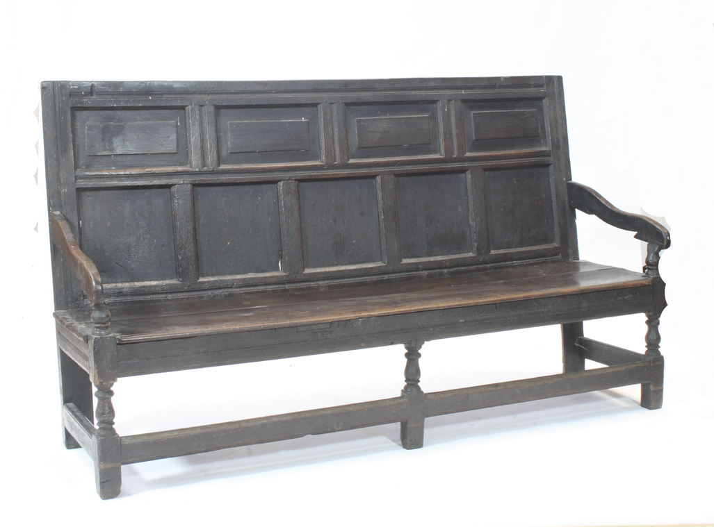 the panelled high back over open out stretched arms, plank seat, raised on block and turned legs, united by stretchers