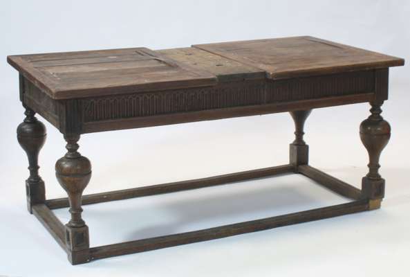 the fluted carved frieze raised on vase turned legs united by moulded stretchers, including two extending leaves, (top lacking)
