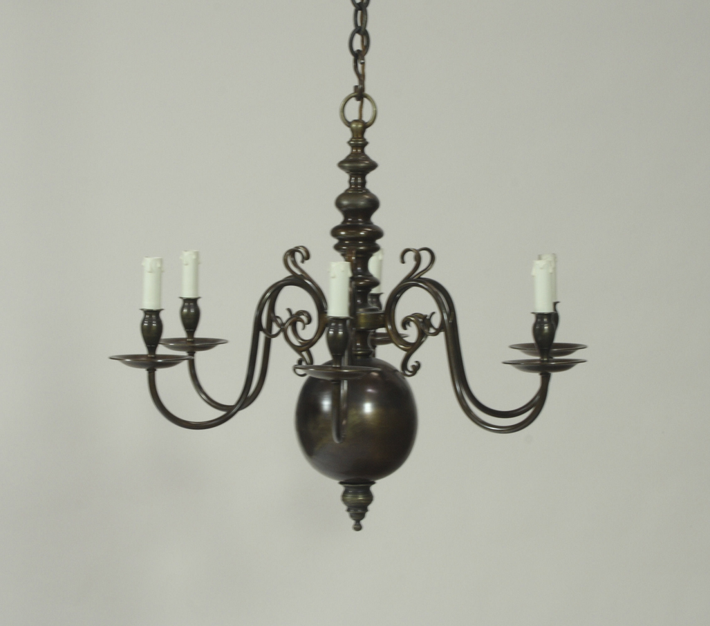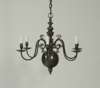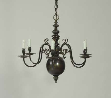 with turned stem and large ball terminating with a finial over down swept branches terminating in drip trays