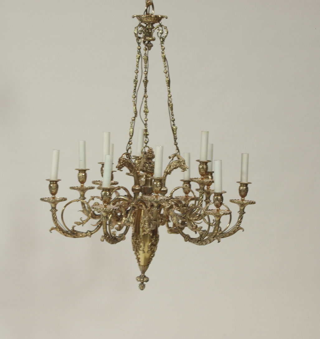 with a elaborate rosette and chains, to goats heads, with a central vase decorated in swags, elaborate foliate scroll arms, terminating in cups and drip trays
