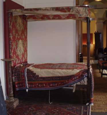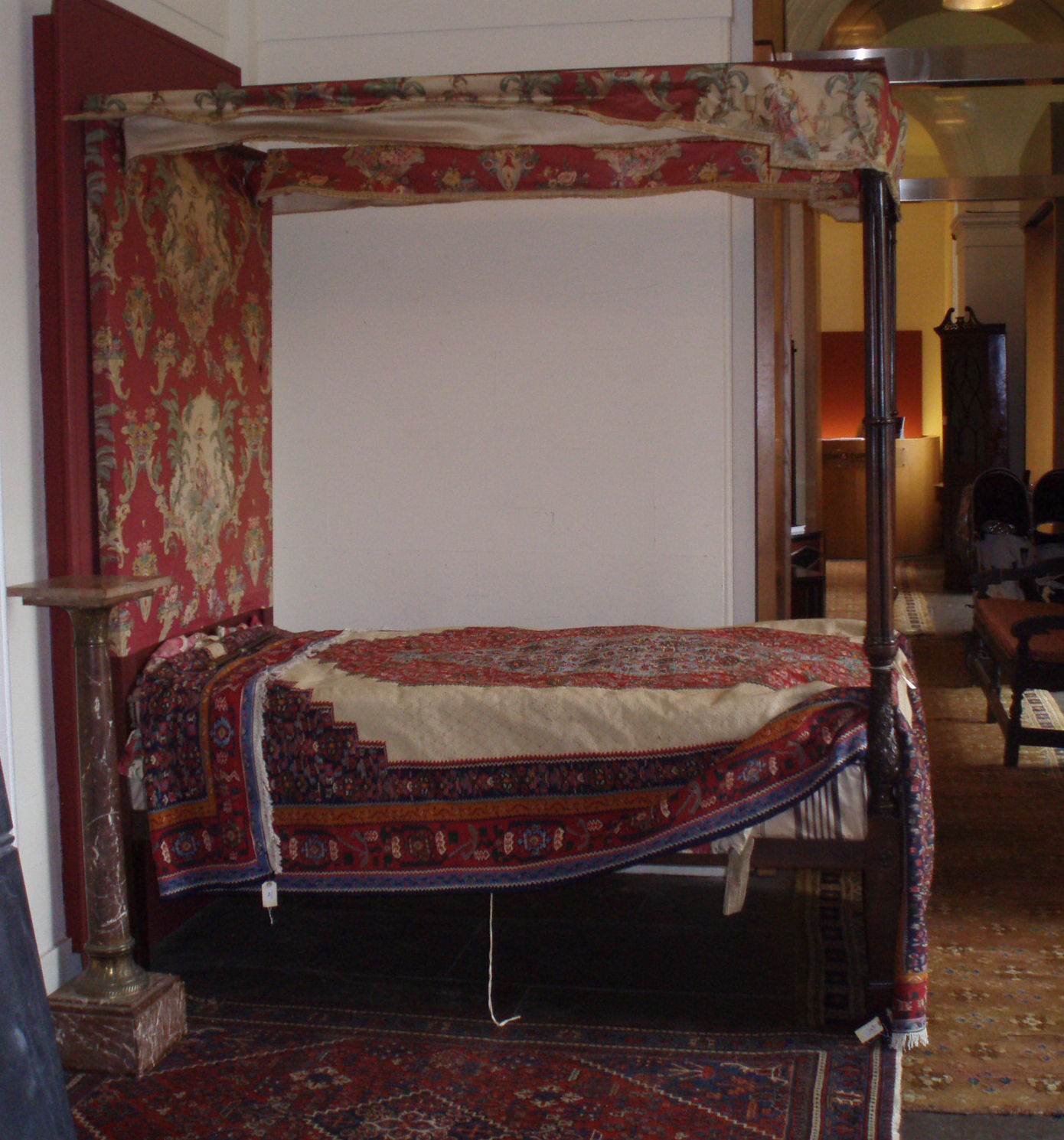 with tapered cluster column front supports, carved with bellflower and guilloche lower sections, the side rails in oak, with foliate patterned fabric hangings, the whole on countersunk brass castors
