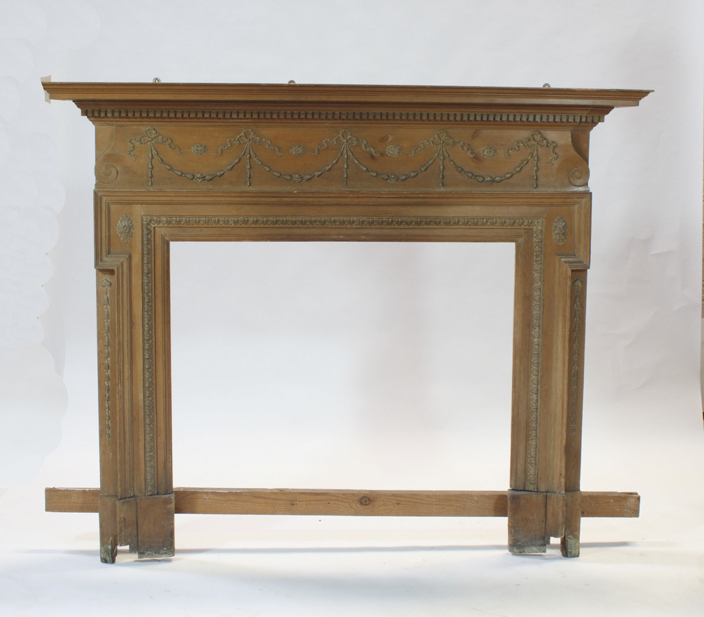 the projected moulded dentil mantle over frieze panel decorated with swags, moulded uprights with egg and dart surround