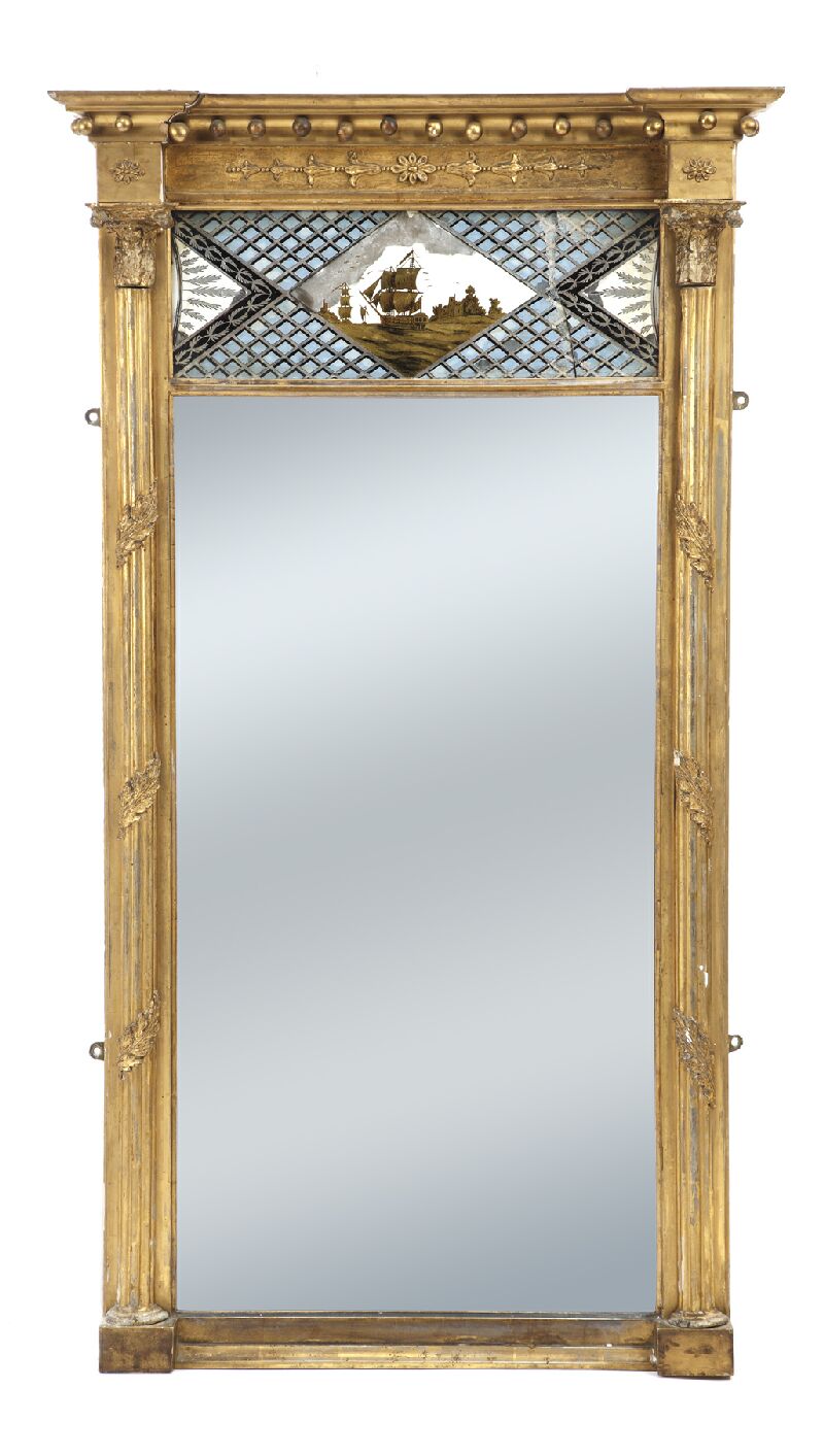 the inverted breakfront ball moulded cornice above a reverse glass painted panel depicting a galleon, below is a bevelled mirror plate enclosed by leaf decorated reed Corinthian pilasters