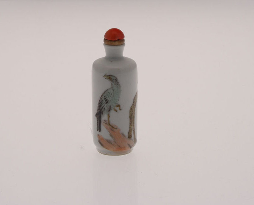 of cylindrical form, decorated with a hawk and a rock by a pine tree, blue painted faux Yongzheng mark, and with a matched hardstone stopper