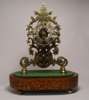 of scrolled design on an oval foliate marquetry base over gilt ball feet, with glazed dome