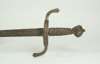 the spiral wooden grip bound with a double twist of silver wire, the flat section quillions and ring guard decorated on the outside edge with foliate scrolls, shaped thumb guard on the inner edge, the double edge blade with two short fullers each decorated with linked ovals with a large tapering writhen pommel, 76cm blade; and a mid 18th century English cavalry broadsword, the wooden grip missing its fish-skin cover and wire binding, the hand guard of round section bars with the outer guard attached to the ovoid pommel with a slotted screw, the front knuckle guard stamped IM behind the wrist guard, the shell guards of differing sizes decorated with incised lines, the double edge blade stamped with the date '1747' above the blade-smith's marks, 79cm blade (2)