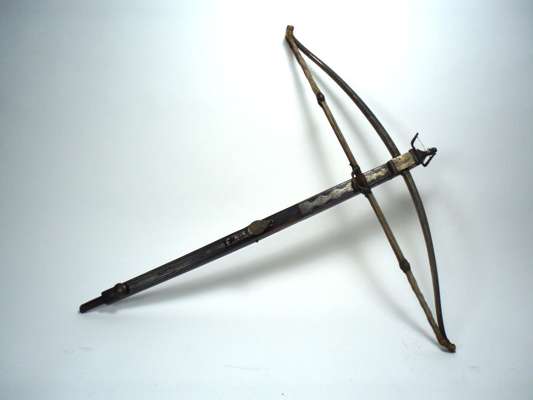 with steel bow fitted with an early string, damaged folding foresight, engraved top plate, signed on the the back sight, the laburnum tiller with missing turned steel finial