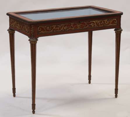 the rectangular glazed lid over foliate scroll frieze panels, raised on faceted tapering octagonal legs