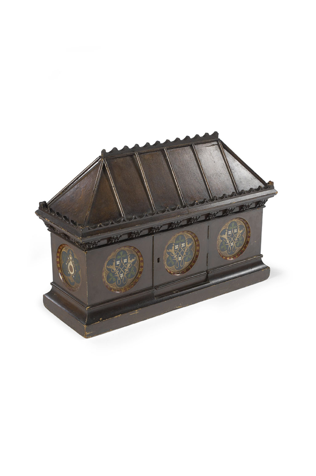 the pitched architectural cover with scalloped mouldings, foliate diaper and a frieze of carved rosettes above sides decorated with foliate painted sunken roundels enclosing a central door, on a cavetto moulded plinth base