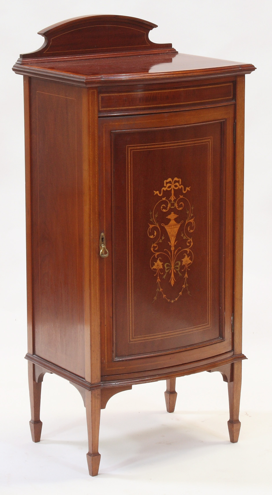 the arched back plate over a crossbanded moulded top above a boxwood and ebony frieze panel, the cupboard door enclosing shelves, raised on square tapering legs with spade feet