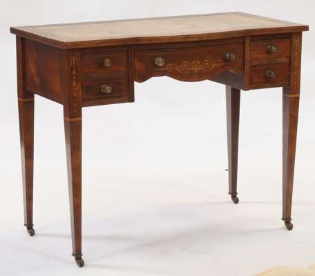 the boxwood strung top with skiver, over a bowfront inlaid frieze drawer, flanked by two short drawers, raised on square tapering legs
