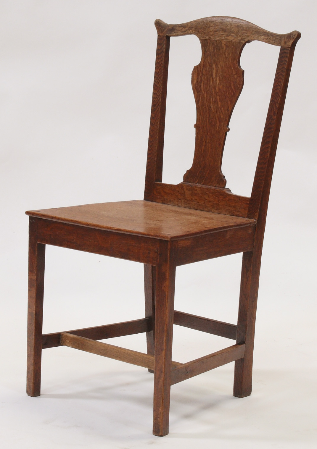 each with serpentine top-rail over a vase shaped splat, the plank seat raised on square tapering legs united by a stretcher (6)