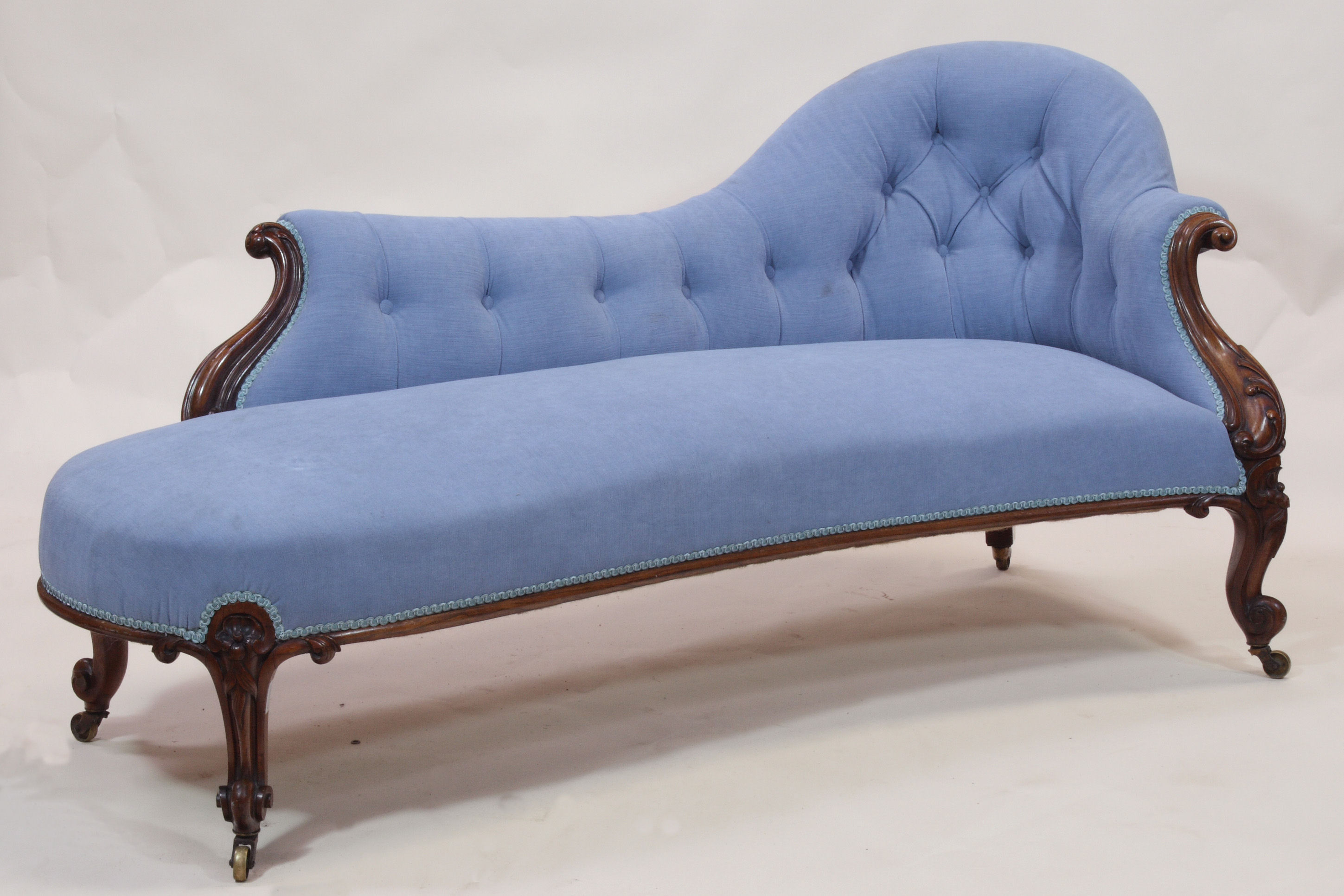the arched back flowing from right to left, with moulded acanthus carved scroll arms, raised on cabriole legs terminating in C-scrolls with brass castors
