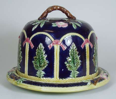 of circular form with branch handle, decorated with floral motifs on a blue ground, with mark