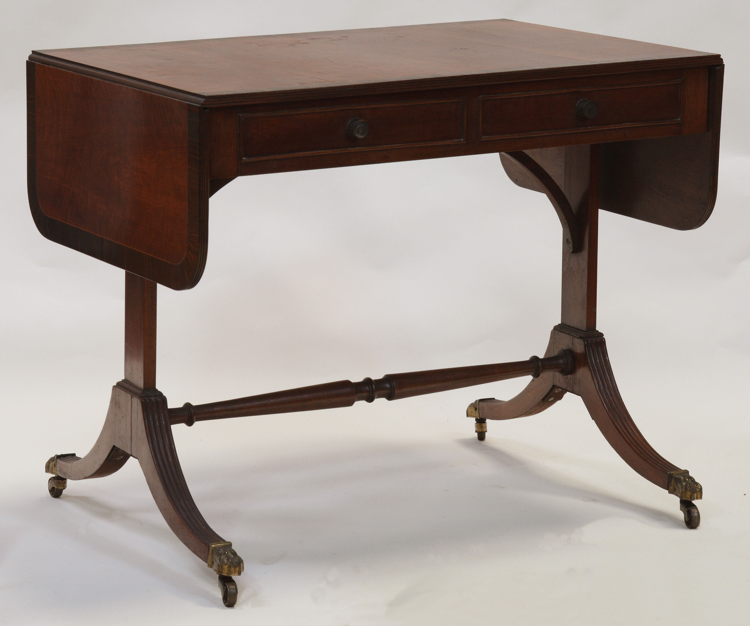 the zebrawood crossbanded rounded rectangular top with reeded edge over two frieze drawers and opposing dummy drawers raised on rectangular supports with reeded sabre legs terminating in brass paw caps and castors, united by a turned stretcher