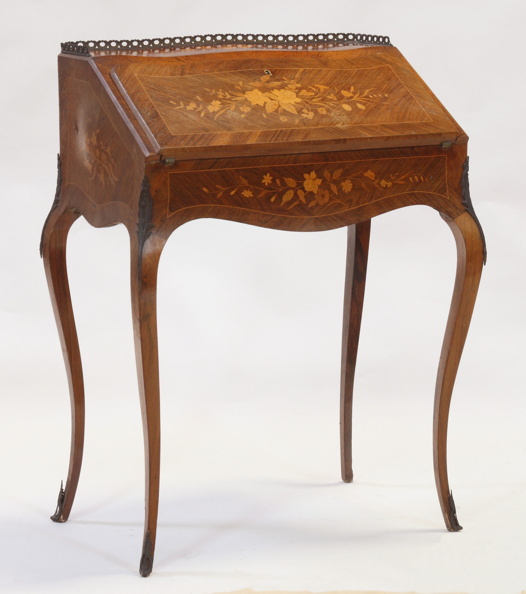 with pierced three quarter gallery over fall-flap enclosing a fitted interior, the serpentine apron raised on cabriole legs with sabots