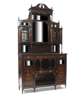 the broken swan neck pediment with urn finials, over a configuration of mirrored back open shelves and glazed cupboards, the moulded base with further cupboards, drawers and open shelves raised on ring turned feet