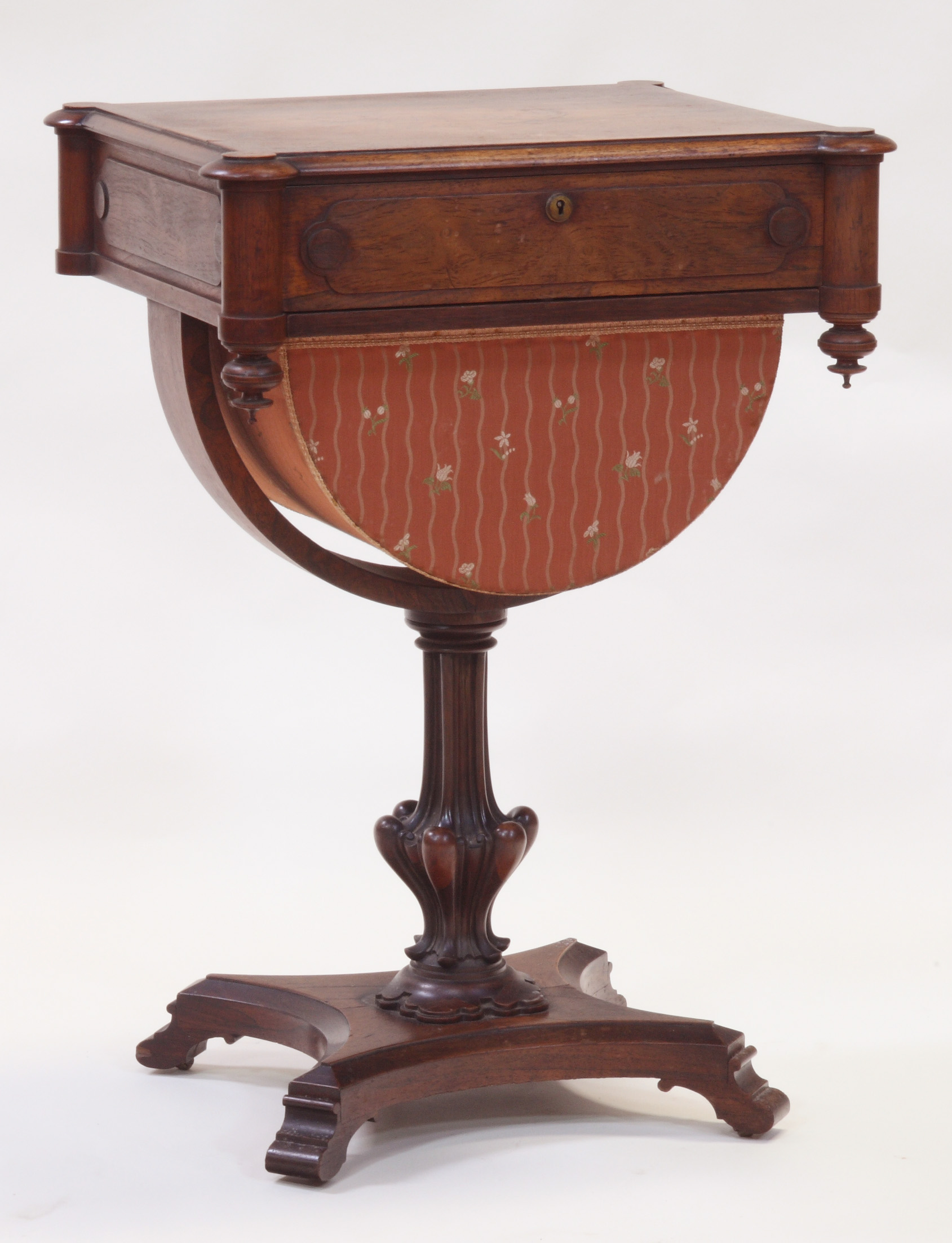the moulded rectangular top with lobed corners over frieze drawer above a work basket with fitted interior, over a foliate carved column with quadriform base and shaped bracket feet
