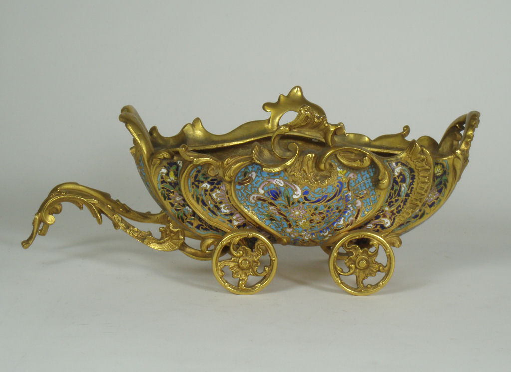 A late 19th century gilt and champleve enamel carriage shaped dish